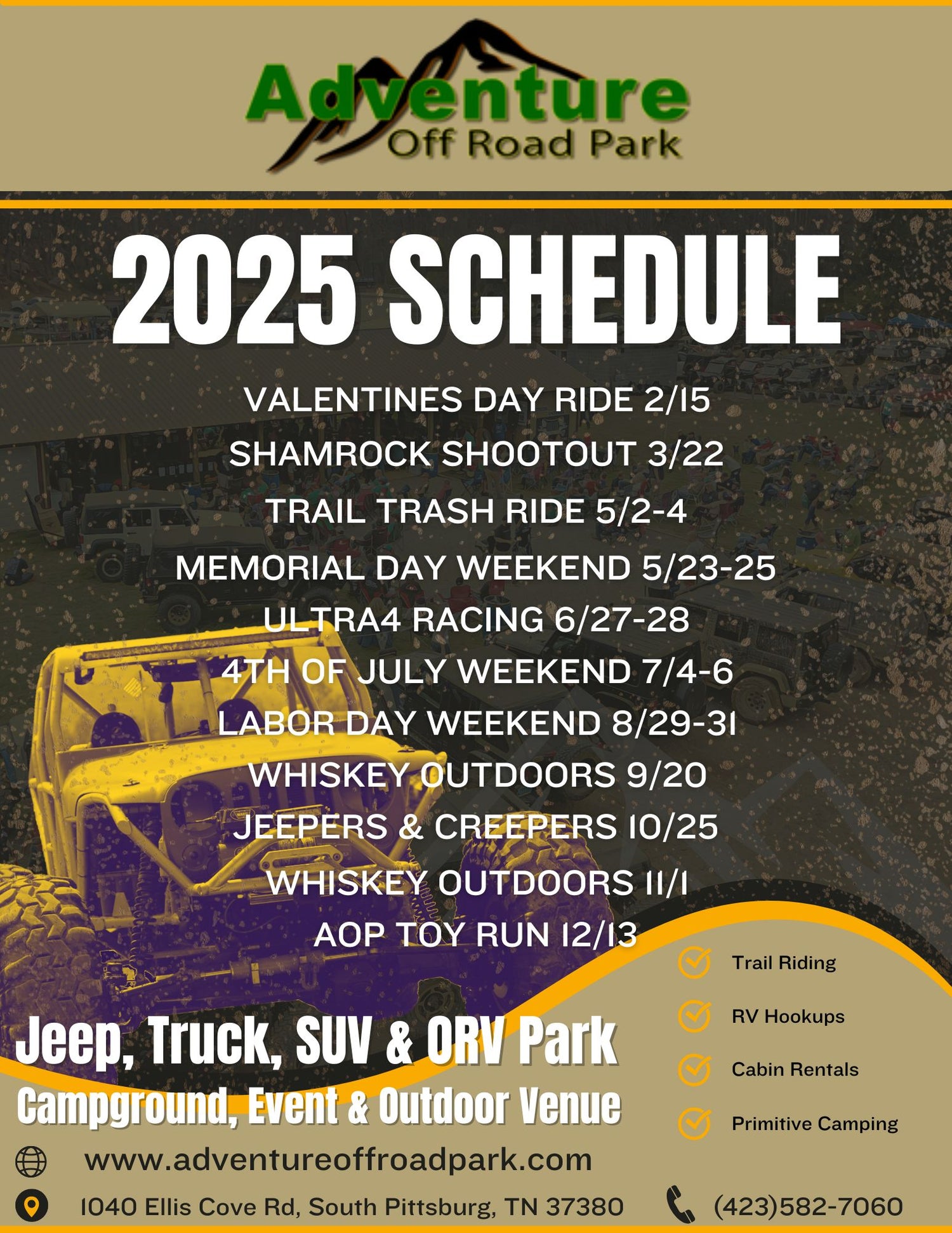 The Adventure Off Road Park and Nature Center consists of more than 600 acres of land, with over 120 off road trails rated from mild to extreme. This off roader's paradise is located in mountains of South Central Tennessee, right in between Kimble and South Pittsburg. The AOP offers, easy off road trails for beginners, to some of the most extreme natural rock trails available. In addition to the AOP Trails, we offer a huge green space for camping, RV hookups, bathrooms and showers, the AOP Pavilion, the AOP Dirt Track and Obstacle Course and the Battle Creek Beach. We host over 20 events throughout the year, from off road races to festivals. Check the AOP Event Listings for information on what's coming up next!
